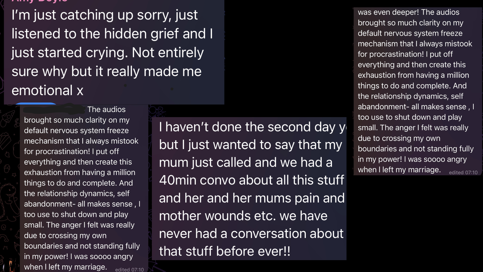 She is very good at unpacking the complexity of what you are feeling and experiencing into something simple and relatable. It’s reassuring to hear about her transformation and ultimately see the proof of the techniques she uses.